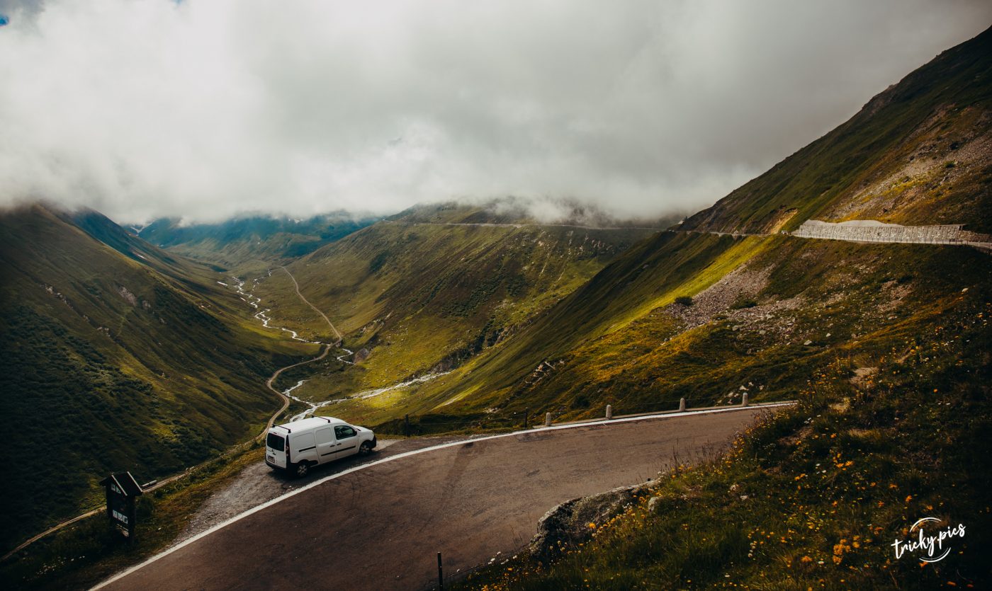 Doch der Rest des Tages brachte nicht nur angenehme Temperaturen und blauen Himmel. Die Autofahrt führte über einige Passstraßen mit gewaltiger Aussicht auf den 2.429 Meter hohen Furkapass. Auch wenn die Bewölkung eigentlich nicht wirklich stark war, so hing dennoch eine Wolkenschicht direkt am Furkapass fest, was immer wieder starken Wind und Nieselregen bedeutete. So brachte der Abend keinen schönen Sonneuntergang, sondern lediglich ein paar Partien Autoquartett im Inneren des Campers.