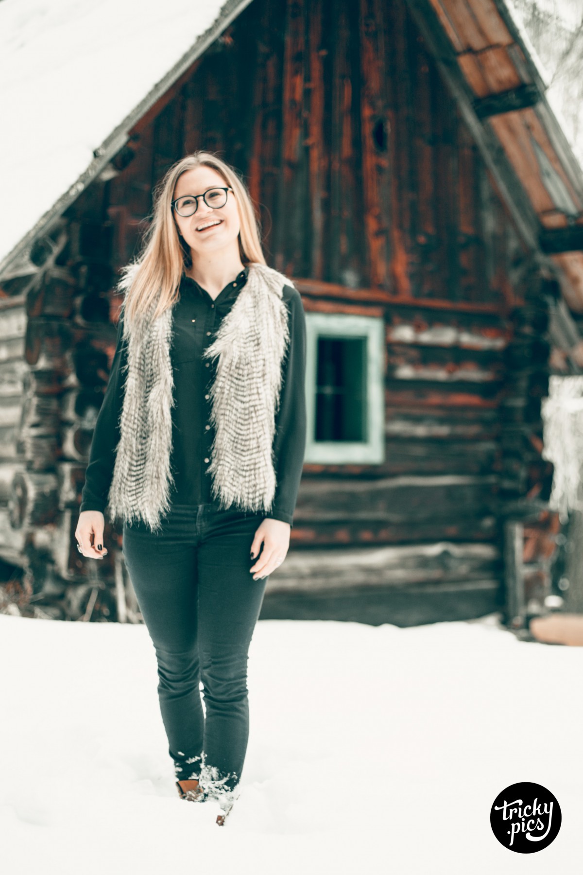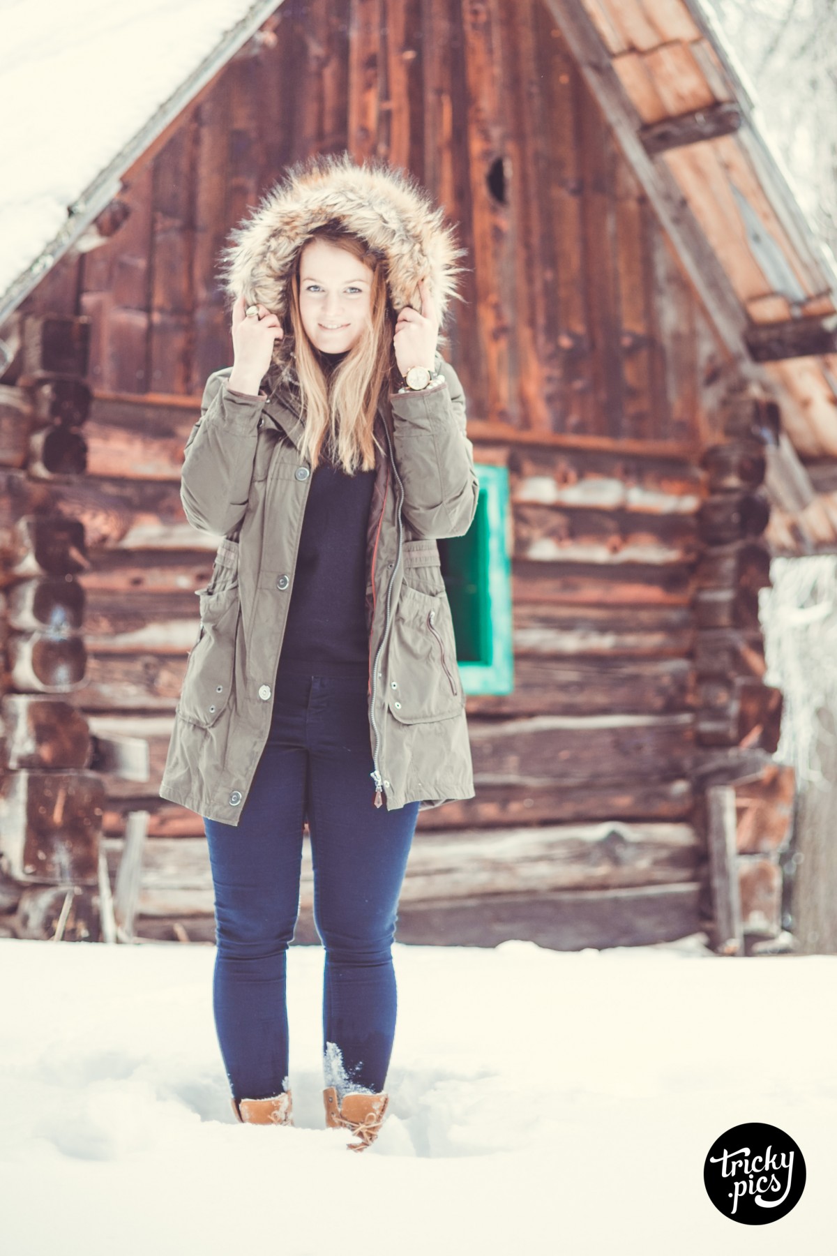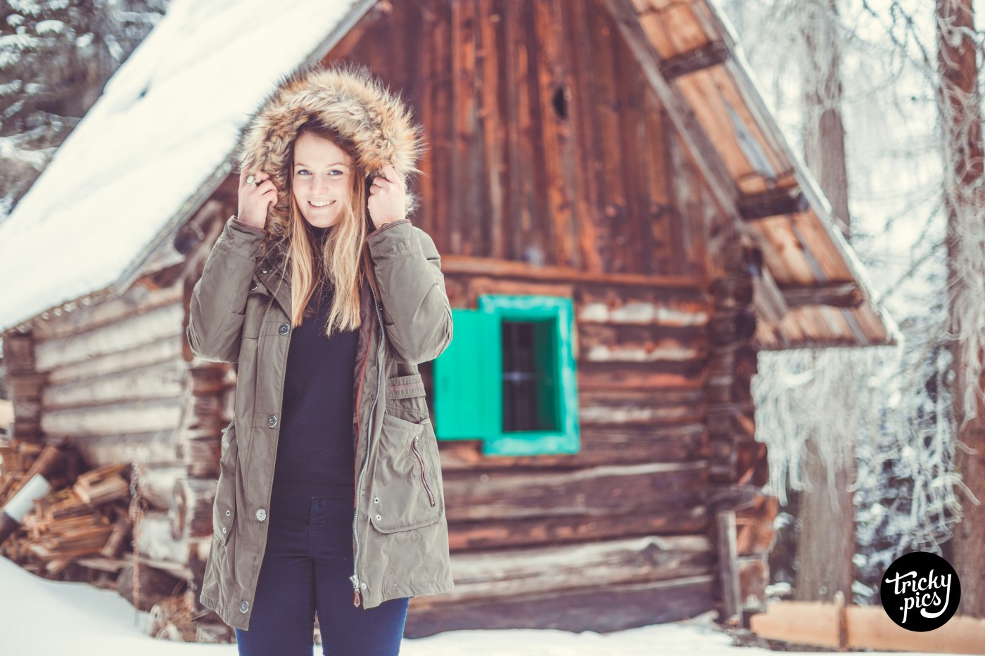 Ich staunte nicht schlecht als mich Jasmin und Theresia beim vereinbarten Treffpunkt zum Shooting mit einem riesigen 4WD Ford Pick-Up Truck abholten. Zugegebenerweise hatte ich auch keine Ahnung wo der Fotospot, den die beiden für das Shooting auserkoren hatten, wirklich liegt. „Eine nette Almhütte“ war ungefähr die einzige Information die ich vorab bekam. Dies reichte mir aber auch, um mir im Kopf ein paar Ideen zurecht zu legen. Es war meine Hoffnung, dass in der Umgebung der Hütte noch Schnee zu finden ist. Als wir dann für einige Kilometer abseits der Straßen auf nichtasphaltierten Waldwegen unterwegs waren, und der Pick-Up ein paar mal trotz 4-Wheel-Drive benahe im Tiefschnee hängen blieb, überraschte mich dann doch. Schlussendlich standen wir in einer vollkommen verschneiten, nahezu perfekten Winterlandschaft vor einem pitoresken Holzferienhaus. Perfekt.